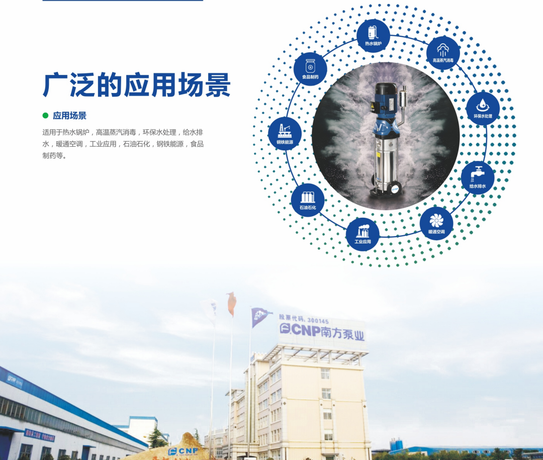 本產品在CDMF輕型立式多級離心泵的結構基礎上,增加了冷卻裝置,適用于最高溫度為+180℃的液體。液體流經冷卻裝置到達機封腔處可冷卻至+120℃或更低,有效保證機械密封的安全工作溫度,同時避免高溫對電機的損害影響。產品擁有CDMF的超高性能,MEI≥0.7。同時采用IE3超高效電機,使產品更加高效節(jié)能,綠色環(huán)保。