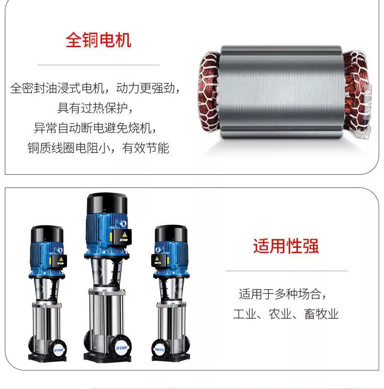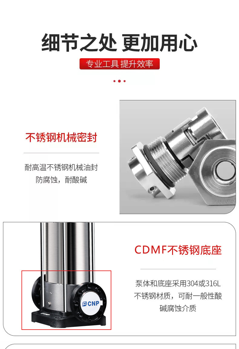 南方CDM/CDMF系列為參照歐洲標準最新自主研發(fā)的新一代、高效率非自吸立式多級離心泵。產(chǎn)品采用全新的工業(yè)設(shè)計,能效指標達到MEI≥0.7,具有節(jié)能、低噪、環(huán)保及機構(gòu)緊湊、外觀美觀、重量輕、使用維護方便、可靠性高等特點。