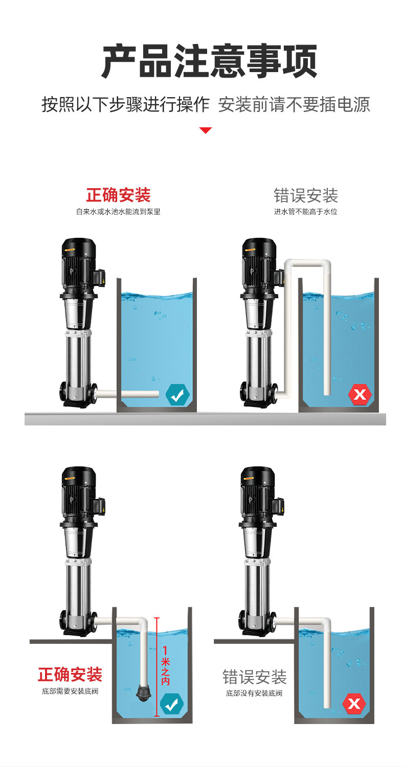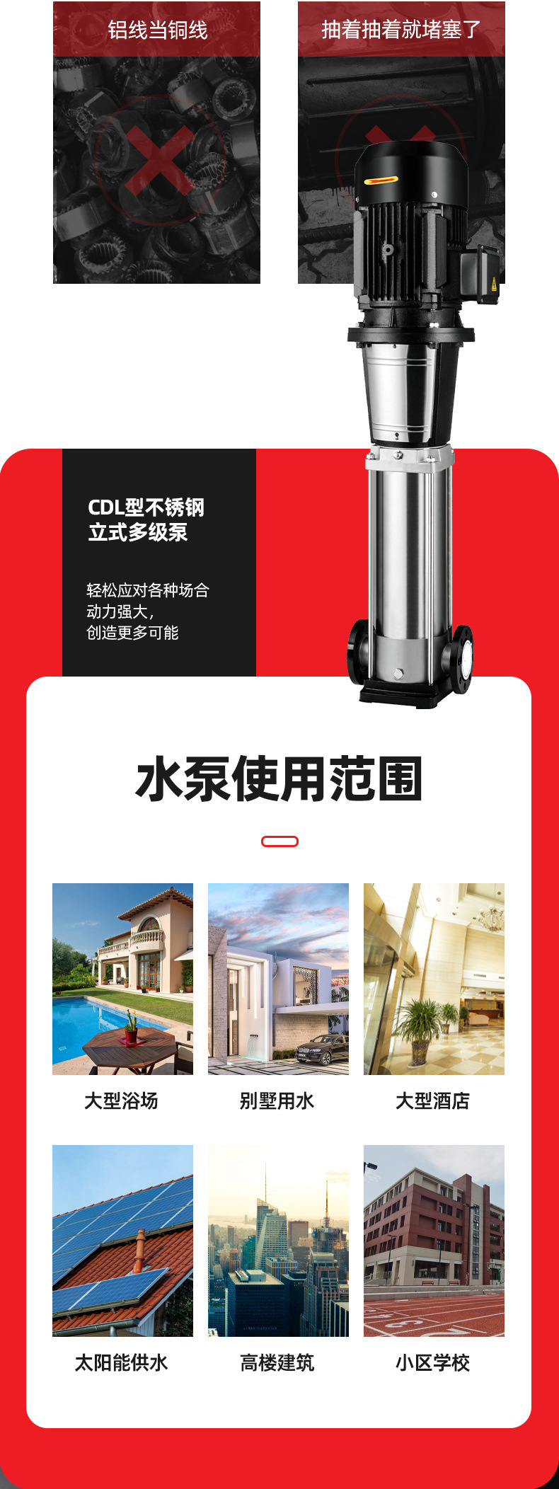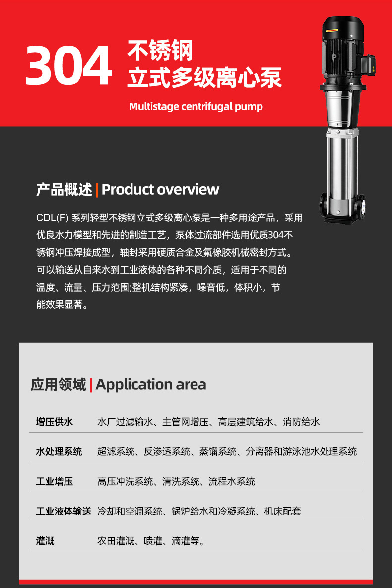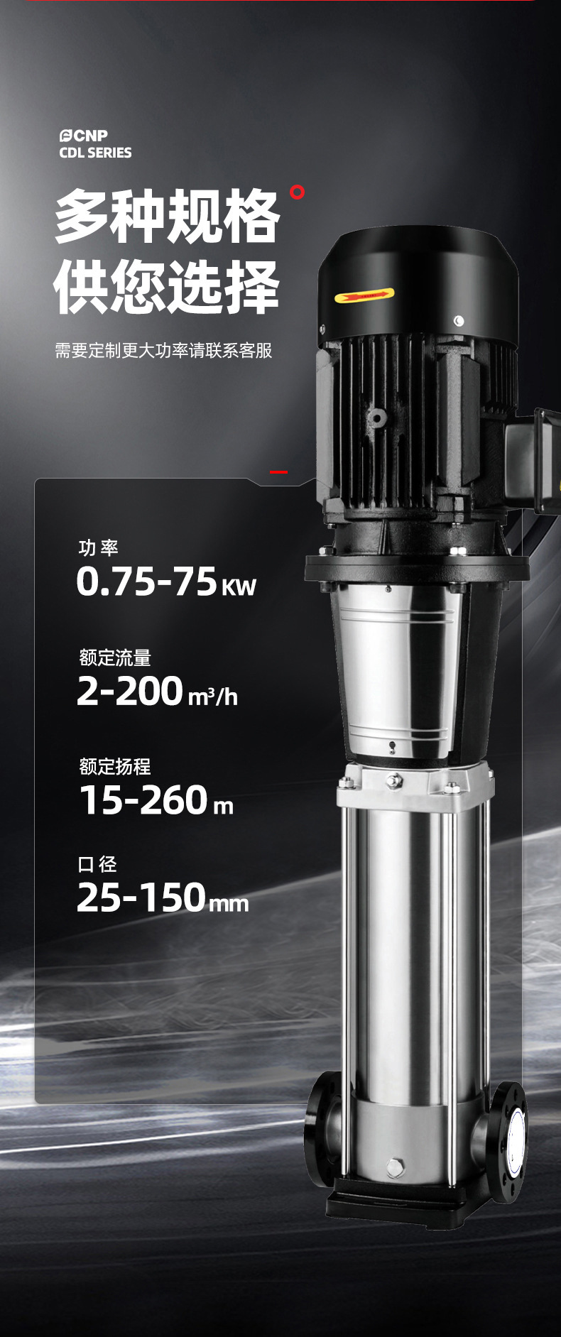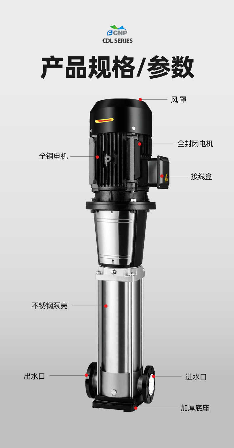 南方CDL,CDLF非自吸輕型立式多級(jí)離心泵,電機(jī)軸通過聯(lián)軸器直接與泵軸聯(lián)接,葉輪導(dǎo)葉采用不銹鋼板沖壓焊接或不銹鋼精密鑄造制成,泵進(jìn)出水口在泵底同一直線上(可配IEC或NEMA電機(jī))。
