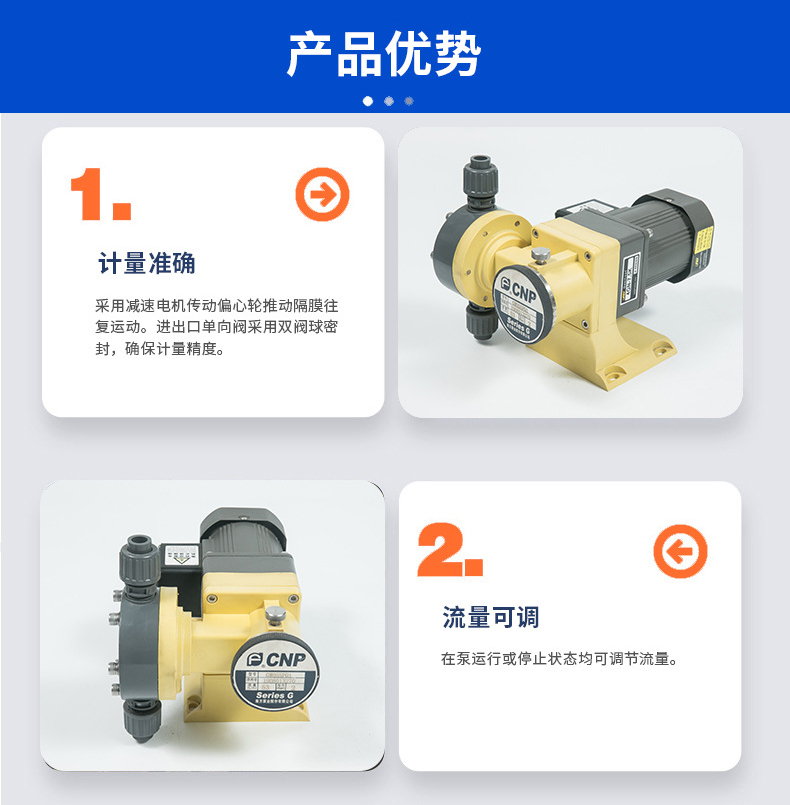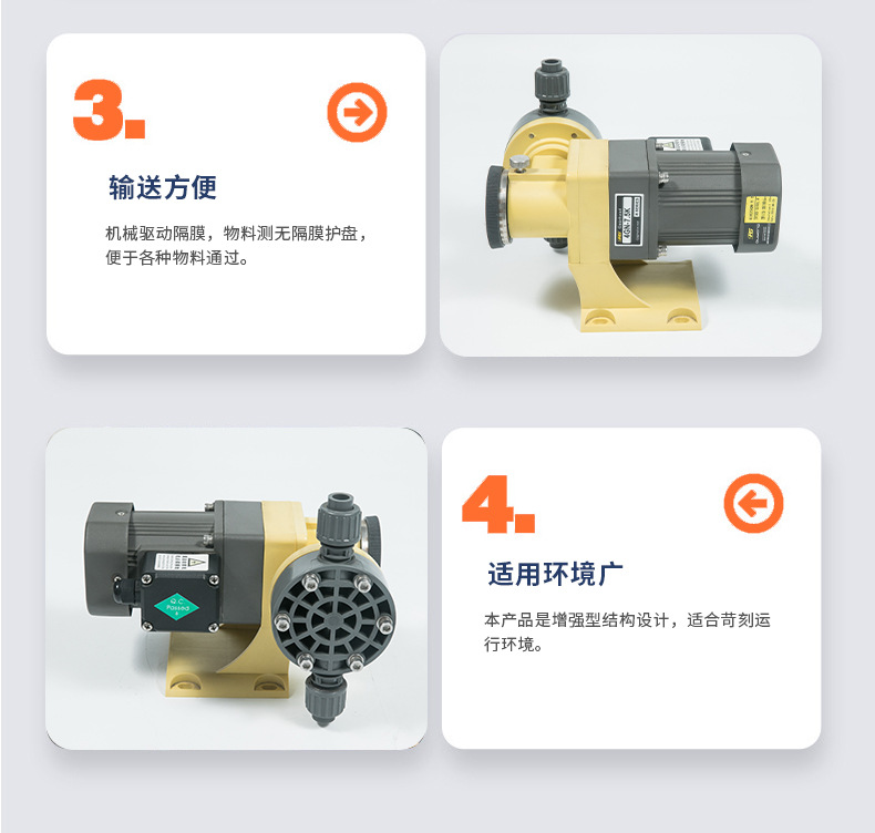 南方GW系列機(jī)械隔膜計(jì)量泵,采用減速電機(jī)傳動(dòng)偏心輪推動(dòng)隔膜往復(fù)運(yùn)動(dòng)。進(jìn)出口單向閥采用雙閥球密封,確保計(jì)量精度。